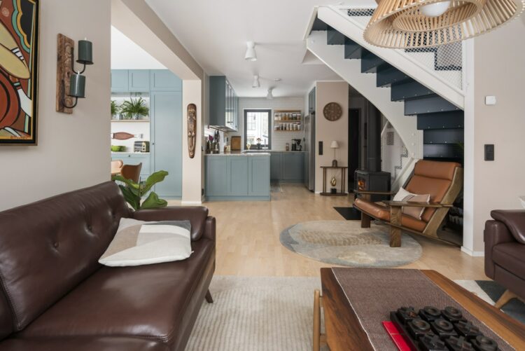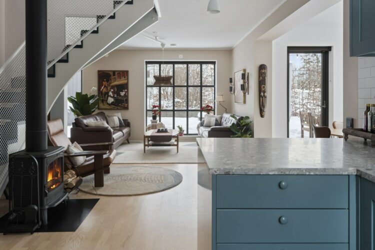 En klassisk ”Blooc-vy” med det blåa köket, gjutjärnskaminen, den ikoniska trappan och industrifönstret i blickfånget.