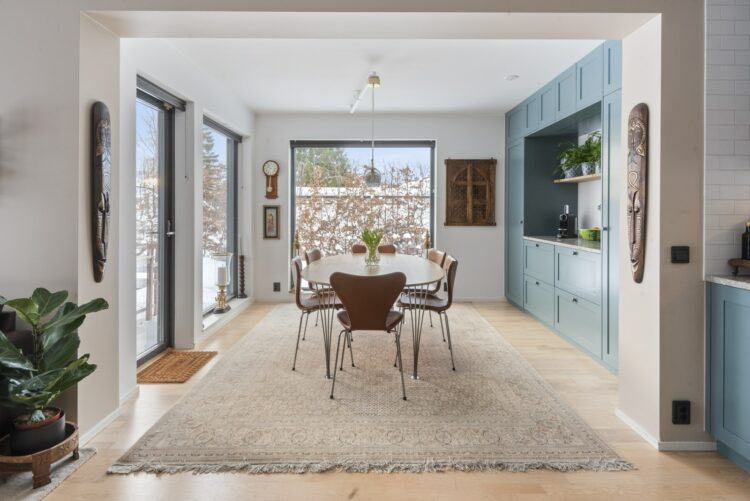 Imponerande utbyggnad som ger en generös matplats och utgång till trädgården. Vi uppskattar särskilt den eleganta platsbyggda förvaringen i samma design som köket.